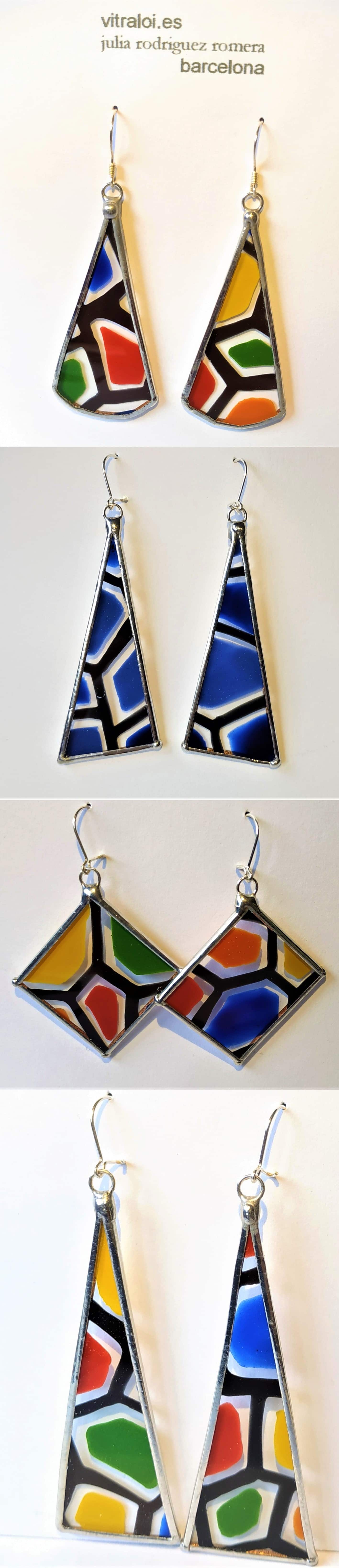 Con estos pendientes tendrás la oportunidad de llevar colgados unos trocitos de vidrieras de colores. Los he pintado con esmalte al fuego y los ganchos son de plata.